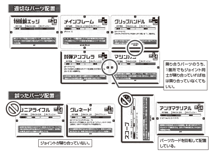 キャラクター作成時のリグは4つのパーツで構成され、各パーツはそれぞれ個別のデータを持っている。追加のパーツを加えていくことで、既存のパーツの強化に繋げたり、新たな機能を持たせることもできる。リグの設計ルールにあわせて、カード状のデザインをされたパーツを組み合わせていくのだ。